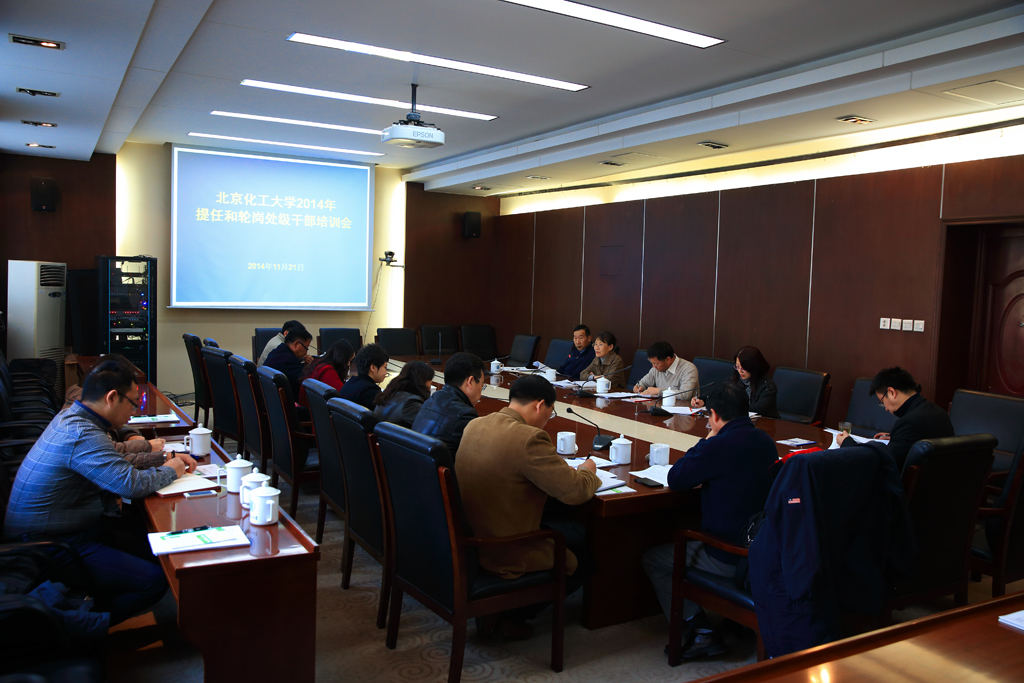 11月21日,以“转变角色,提升业务水平和领导能力”为主题的2014年新聘岗处级干部培训会在行政楼203召开。校党委书记王芳、校长谭天伟、党委副书记兼纪委书记关昌峰、党委组织部部长毛立新出席会议。全体新提任和轮岗处级干部参加了培训会。