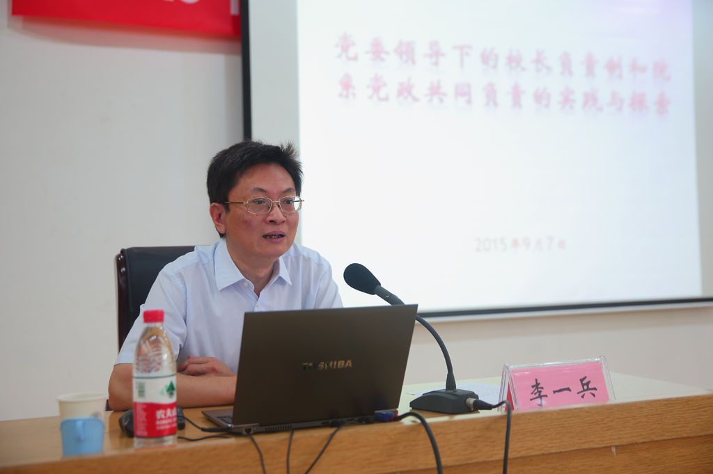 清华大学党委组织部部长李一兵作“党委领导下校长负责制”的专题报告。李一兵部长全面、深入分析了我国高校领导体制的发展历程。他指出,要贯彻党委领导下的校长负责制,首先要把握好集体领导、民主集中、个别酝酿、会议决定这四个环节。他强调,对于学校重大事项应当实行集体决策,同时应当充分发扬民主,深入基层,调查研究,做决定前班子成员要事先交换意见,最终形成科学化、规范化决策。学校各部门应当按照集体做出的决策做好各自分管工作,统一思想,统一认识。